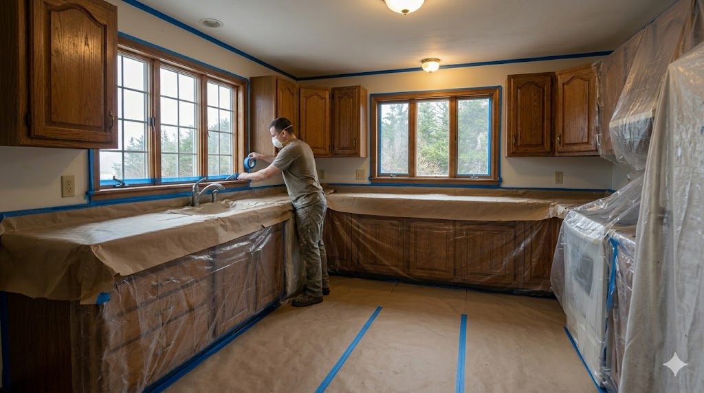 Work areas are carefully protected, and cabinets are cleaned and prepped. - 3